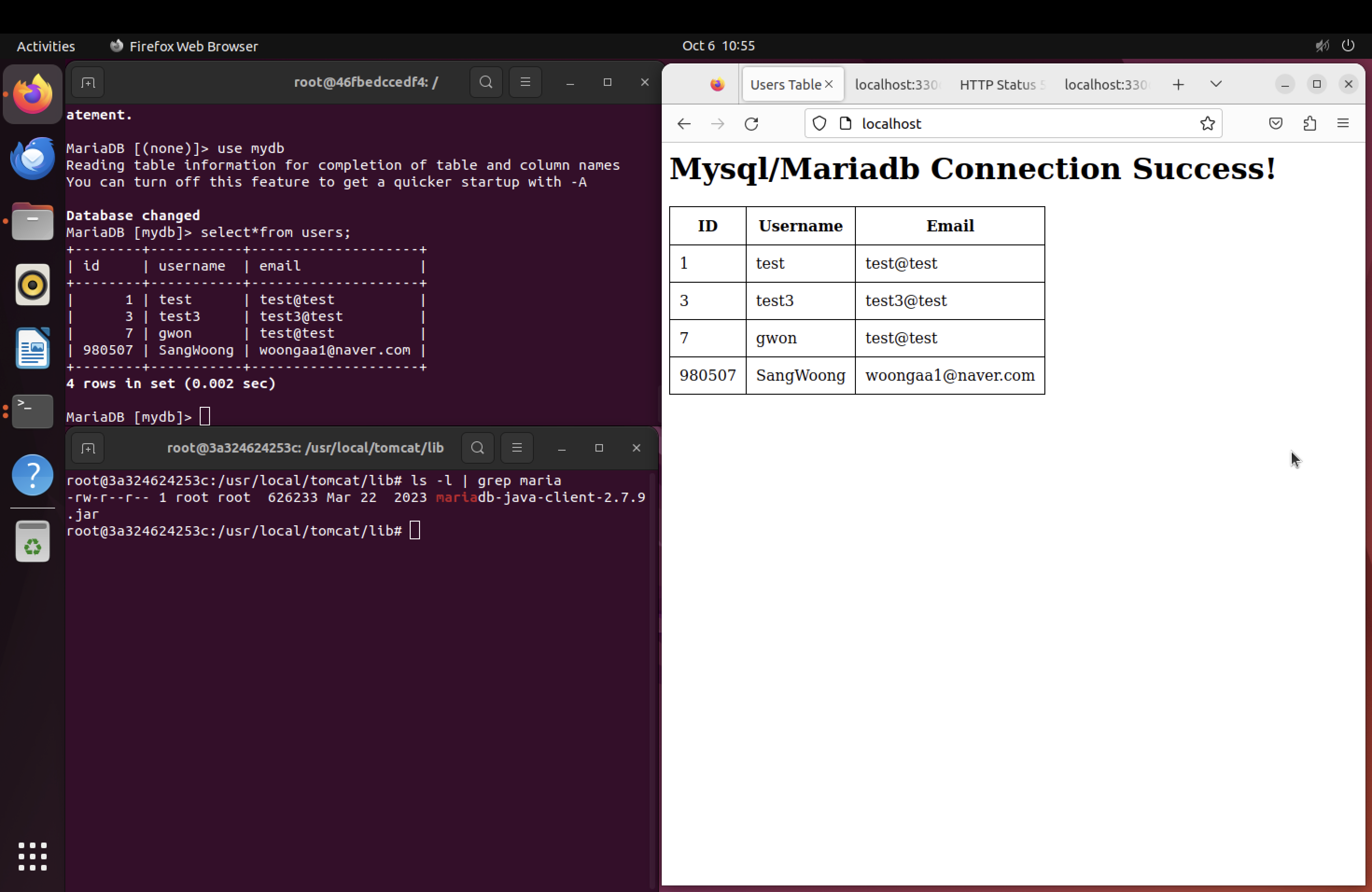 Docker 컨테이너 환경에서 Tomcat과 MariaDB를 연결해 데이터를 조회하는 과정